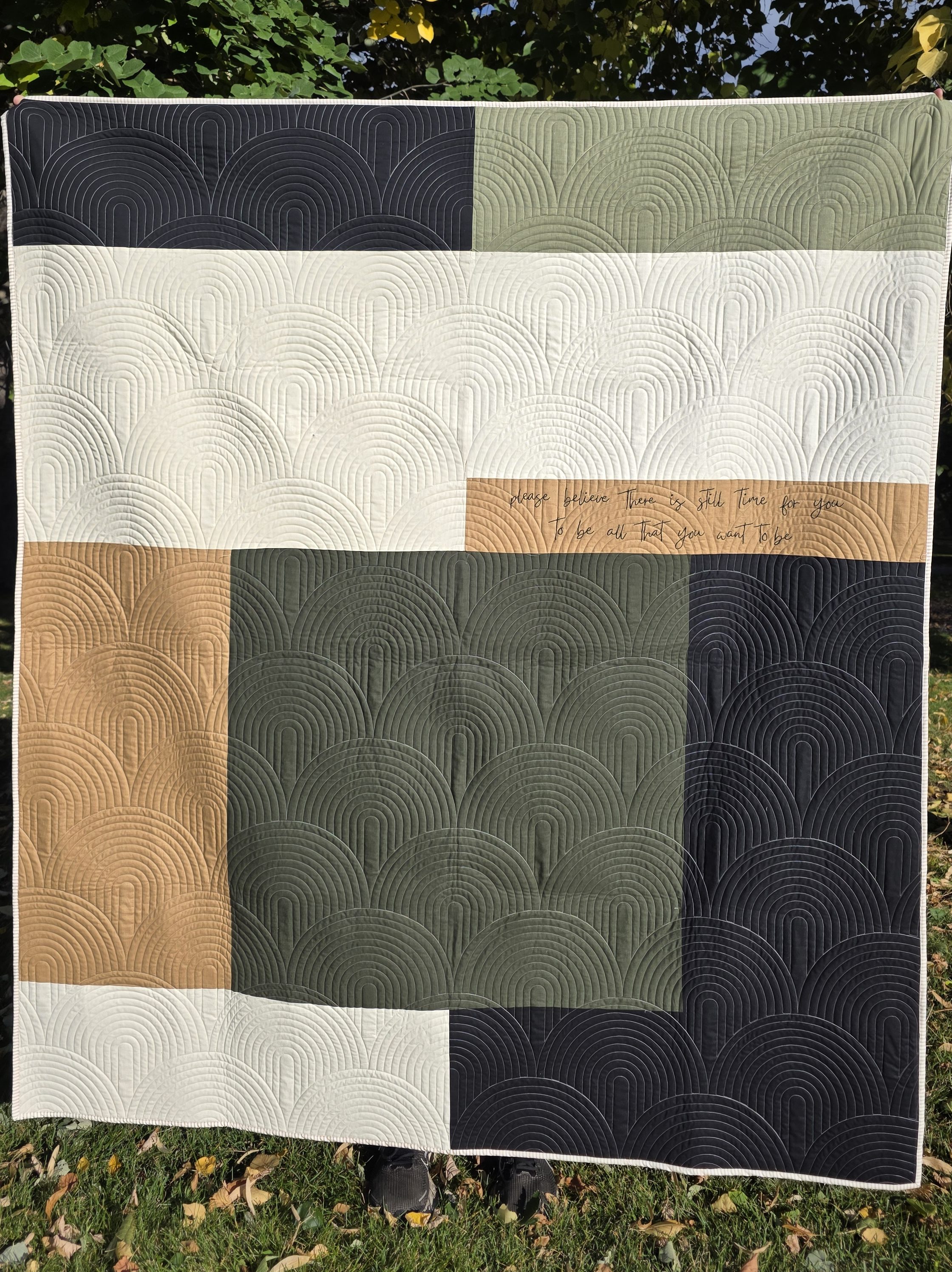 Every design is imagined and some are hand-embroidered by our founder, Amanda Christenson, stitched with messages like “you are worthy of love,” “breathe,” and “good things are coming.” These quilts are lovingly pieced and finished by Teresa Walker and beautifully quilted by Emmy Evans, making each one a collaboration of heart and craft.